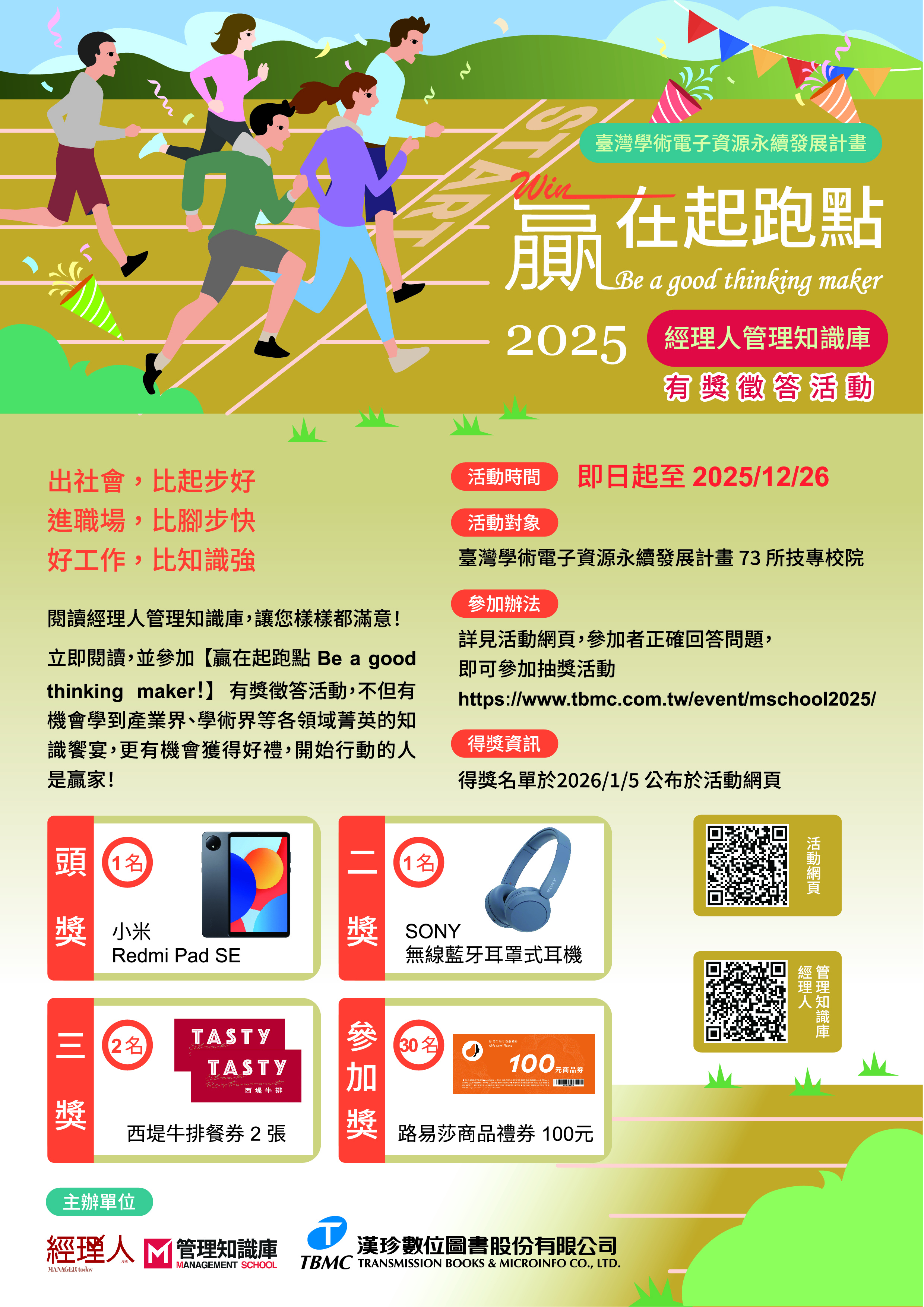 參加辦法:詳見活動網頁,參加者正確回答問題,即可參加抽獎活動 「經理人管理知識庫」連線網址:https://elib.infolinker.com.tw/mschool/login_mschool.php (校外使用請先登入「電子資源查詢系統」)活動禮品:小米 Redmi Pad SE、SONY 無線藍芽耳罩式耳機、西堤牛排餐券、路易莎商品禮券 即刻起,立即閱讀並參加活動,就有機會獲得好禮,開始行動的人是贏家!